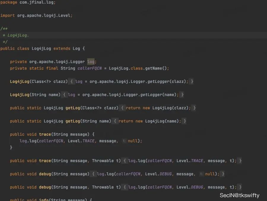 以JFinal4.5为例,因为本质上的实现其实是封装了一个org.apache.logging.log4j.Logger,然后调用log4j2对应的方法。没有spring那么复杂。只需要找到用户可控且调用了com.jfinal.log中对应的日志方法的class就可以了。下面记录具体的过程: