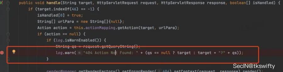原因主要是handle方法在处理Action的时候,如果请求的path中包含.的话(poc里恶意的jndi地址里的域名/ip会使用.进行分隔),会直接return,并没有处理日志逻辑: