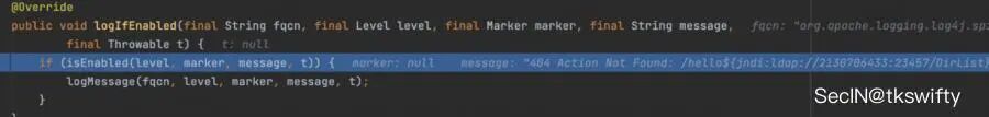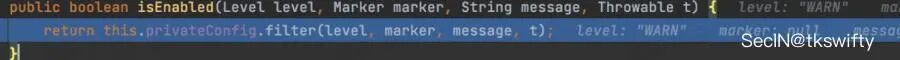 熟悉log4j2漏洞调用链的话应该知道logMessage后具体会调用jndilookup的逻辑,那么问题应该是在isEnabled方法这里了: