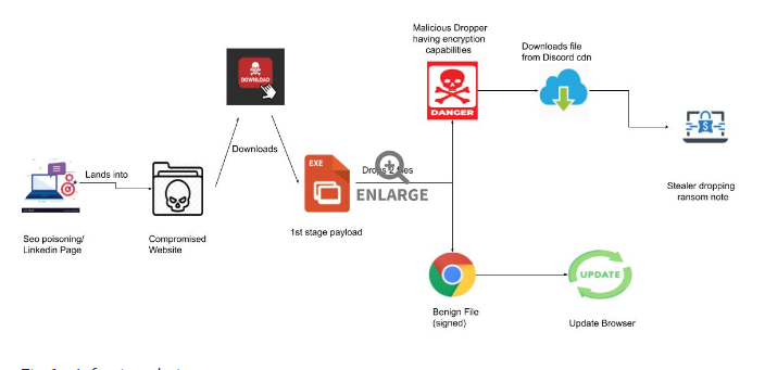 RedEnergy采用多阶段的攻击链。攻击开始于用户通过LinkedIn个人资料点击访问目标公司的网站。用户被重定向到一个欺骗性网站,指导他们安装伪装成合法浏览器更新的可执行文件RedStealer。无论用户点击哪个浏览器图标,都会被重定向到相同的URL进行下载。RedEnergy利用欺骗性下载域名下载一个假的ChatGpt离线版本获取同样恶意的可执行文件,然后使用勒索软件模块对用户数据进行加密,并添加“.FACKOFF!”扩展名。同时,它会删除备份文件,以增加对用户数据的威胁和勒索力度。这种攻击方式使得RedEnergy能够在用户不知情的情况下入侵系统,并对其数据进行加密,造成严重的数据损失和勒索威胁。