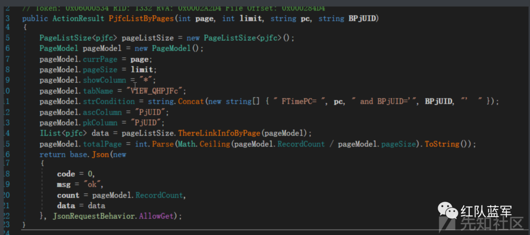 其中PjfcListByPages 获取四个参数,并直接在pageModel. strCondition = string.Concat(new string] {" FTimePC=", pe, " and BPjUID='", BPjUID, "" 拼接,导致注入发生