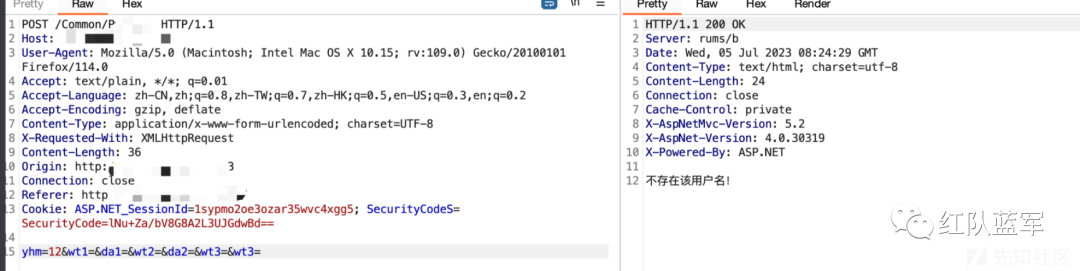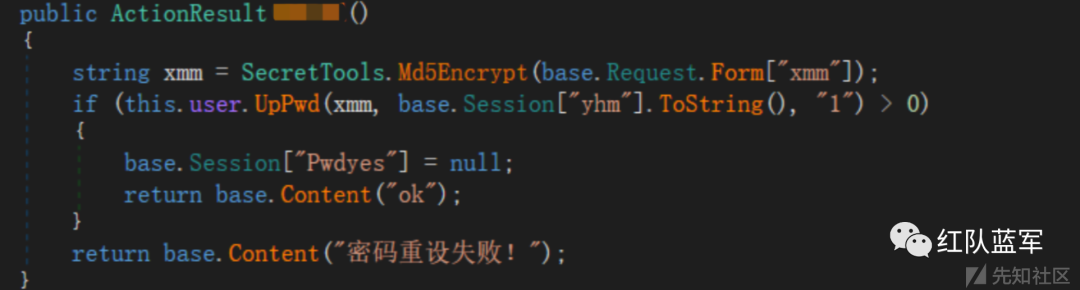跟进密码重置模块查看,获取用户输入 xmm,之后通过this.user.UpPwd(xmm, base.Session["yhm"].ToString(), "1") 更新了账户密码,只要session存在即可触发该漏洞,而session只需要通过上面的找回密码第一个步骤即可获取