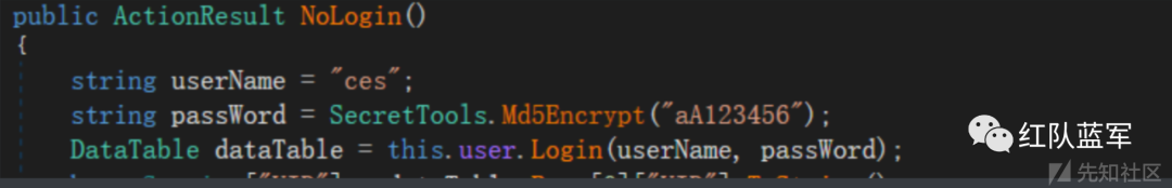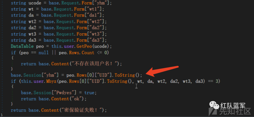用dnspy直接反编译查看源码,先来到我们的入口,密码重置处查看一下相应的代码逻辑,果然和我们想的一样,这里先通过string ucode = base. Request. Form["yhm"]; 获取用户输入yhm,并传递给ucode,然后通过 DataTable peo = this. user. GetPeo(ucode) ; 来查询该用户名是否存在,之后进入if语句中,如果用户名不存在则直接返回不存在该用户名,存在则通过base. Session["yhm"] = peo. Rows[O]["UID"]. ToString() ; 设置会话session,而问题也恰恰出现在这里,这里并没有判断用户名和密保问题是否相匹配直接设置了session导致了任意账户密码重置漏洞的发生