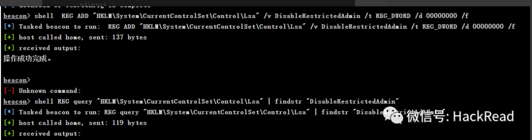REG ADD "HKLM\System\CurrentControlSet\Control\Lsa" /v DisableRestrictedAdmin /t REG_DWORD /d 00000000 /f //开启Restricted Admin mode