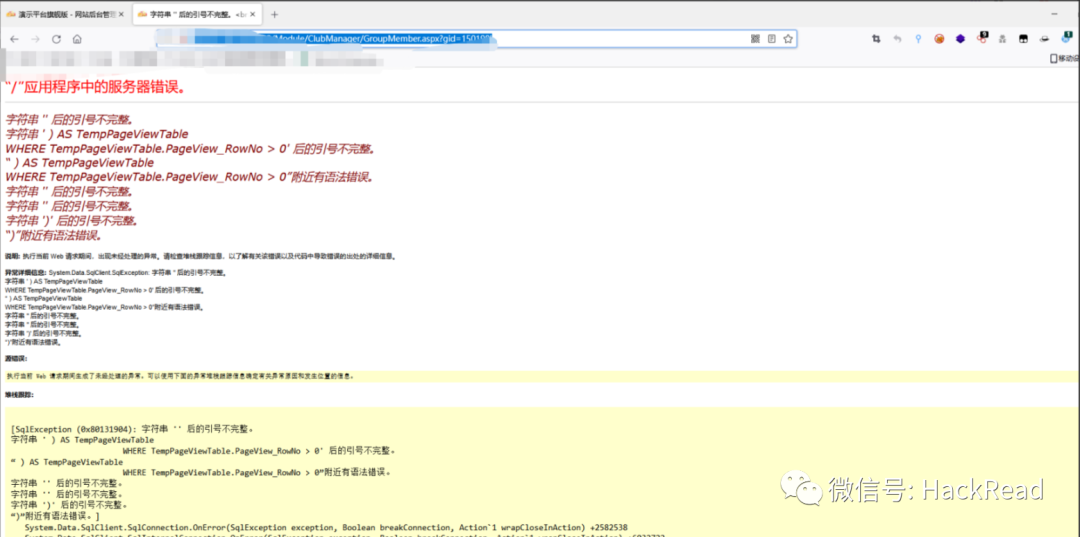 翻看了很多功能点,在一处功能点发现上传接口,并尝试上传文件,发现无法上传,加了白名单。直接选择放弃,继续寻找。在某一个http://url/GroupMember.aspx?gid= 参数上加上单引号,直接报错,SQL注入这不就来了么。