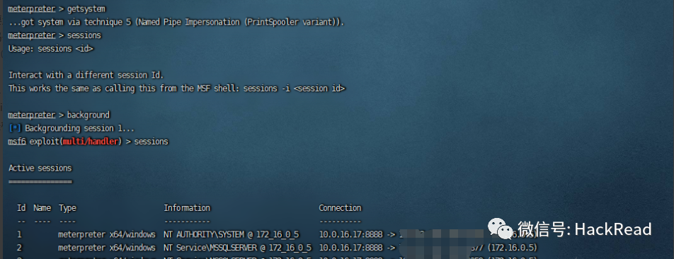 session已经上线,接下来目标就是获取system权限。很幸运直接getsystem可以获取system权限。如果需要提权推荐土豆家族提权,实战中成功率很高,影响的服务器版本也很多。