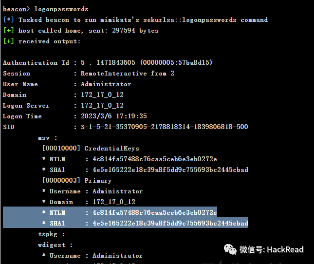 因为是win2012无法获取明文密码,直接修改管理员密码稍有些不妥。尝试通过获取管理员NTLM远程登录机器。(并非同一台,这只是提供一个思路)