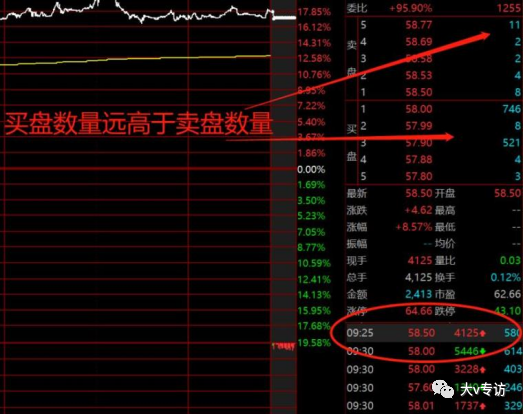 除了看竞价过程,我们还要看竞价最后一秒的盘口,就是那个五档盘口,竞价出来后,剩下的都是未成交的,如果买盘远高于卖盘,那说明挂单买入的人非常多,他们想买,但是部分未成交,要是叠加竞价高开,那么股价上涨的概率就会增加。