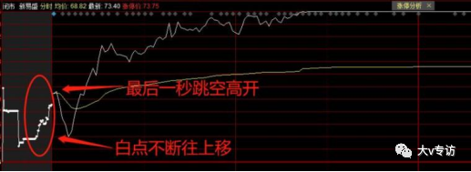 这个胜率很恐怖吧,是真实的数据,大家可以打开软件动手去测一下,也能得出相同的结论,当然,每天数据都会变,据我了解,这种真实的高开强化,上涨概率极大,我身边就认识一位做集合竞价的朋友,好像他还加入其它数据判断,竞价直接买卖,做的很不错。 还有一种竞价也可以留意,虚假的低开弱化,名字完全相反,原理跟真实的高开强化差不多,9:20到9:25这段时间内,白点不断往上移动,最后一笔跳空向上,但是结果相反,虚假的的低开弱化的股价在竞价期间是负的,也就是是说它始终在水下运行,我们来看案例: