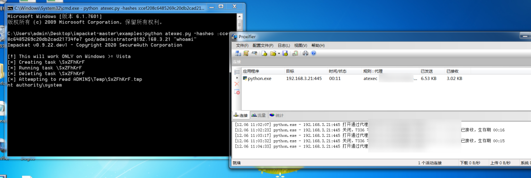 这时代理设置好了之后,我们就可以直接在本机中使用atexec.py对其内网进行横向移动了,具体命令如下:
