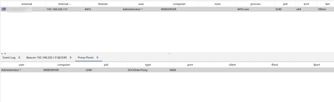那么在这里,我们上线CS的步骤也和上文中使用atexec.exe上线步骤一致,这里不再演示。在内网渗透中,IPC是我们经常用到的手段之一,若⽬标管理员对服务器禁⽤远程登录我们就可以使⽤ IPC 来完成⼀些操作,在IPC横向移动时,较为推荐使用atexec.py+socket代理的形式对其内网进行横向移动,相对来说动静较小,不易被发现。