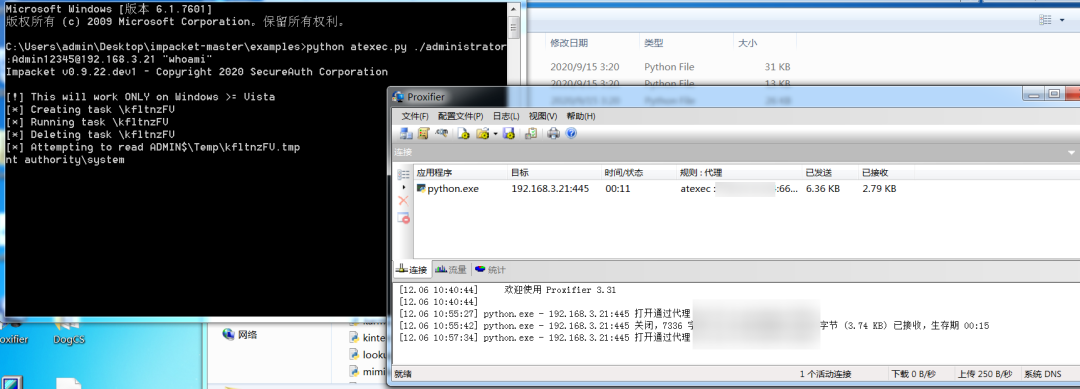 在上文中,我们讲述了在命令行下通过使用计划任务来进行横向移动的效果,但该效果相对来说不太方便,例如只适用于明文密码进行连接,无法支持hash、在执行了命令后,无法获得回显等。这里我们可以使用Impacket-atexec工具,impacket是一个打包好的工具包,里面包含了对于各种协议和系统命令的利用工具。对于at&schtasks,我们可以使用impacket中的atexec.exe,使用它可以轻松地进行远程连接并执行系统命令。impacket有两个版本,一个为exe可执行程序,另一个为python文件,该工具适用于Webshell下,Socks代理下,并且支持以hash的方式进行连接。
