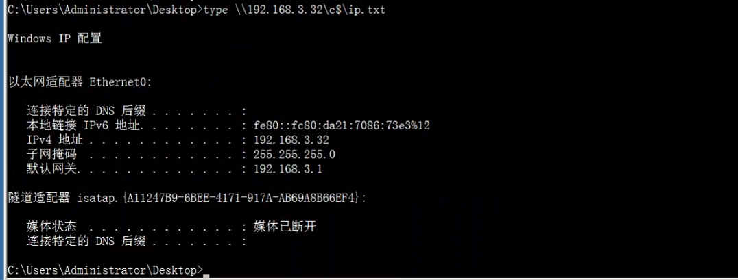 若是想要查看⽬标 C 盘下的 ip.txt ⽂件就可以使⽤ type 命令