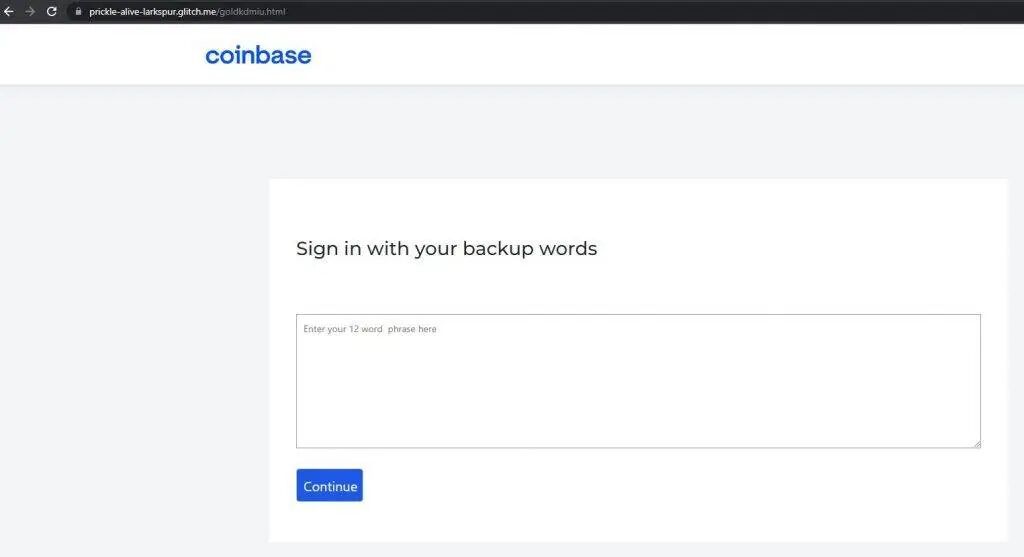 用户点击链接后,他们会被重定向到一个页面,在那里他们会被要求输入他们的种子短语。种子短语(恢复短语)是一个由12个(不太常见的是24个)单词组成的序列,用于恢复对加密钱包的访问。这实际上是钱包的主密码。种子短语可用于获得或恢复对用户帐户的访问权限并进行任何交易。种子短语无法更改或恢复:如果放错位置,用户就有可能永远无法访问他们的钱包,并将其交给攻击者,从而永久破坏他们的账户。