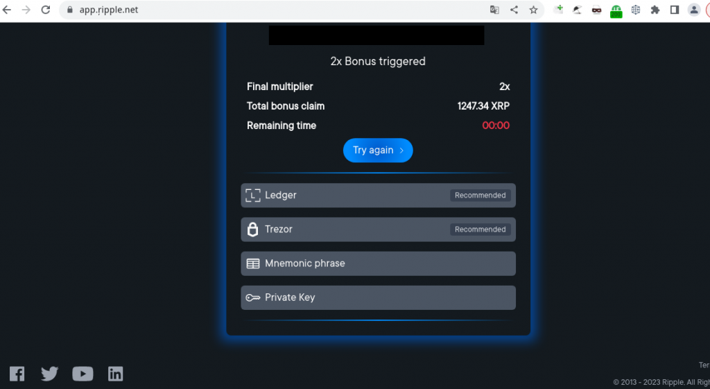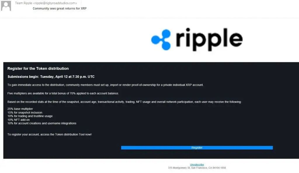 这种类型的攻击始于加密电子邮件活动:用户收到一封来自Ripple加密货币交易所的电子邮件,并提供加入XRP代币(该平台的内部加密货币)的赠品。