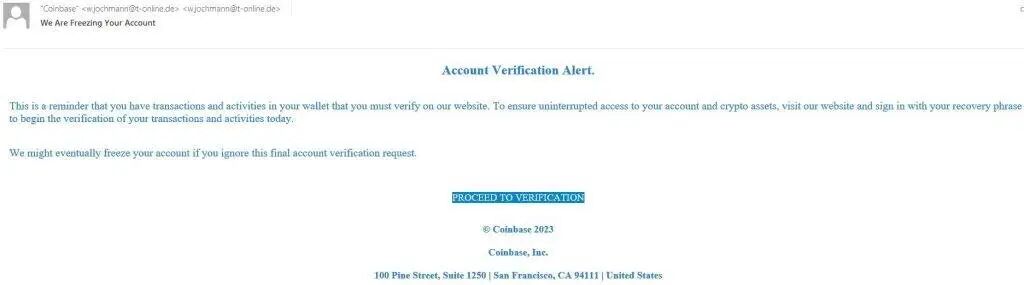 针对热钱包用户的典型网络钓鱼骗局如下:攻击者发送来自知名加密货币交易所的电子邮件,要求用户确认交易或再次验证其钱包。