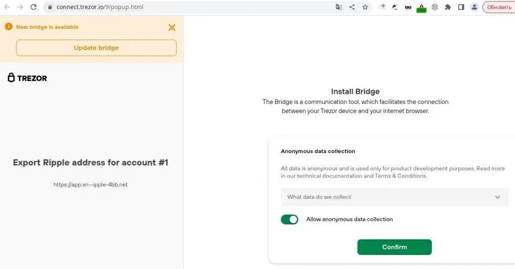 当用户试图连接到第三方网站时,Trezor connect会要求他们同意匿名收集数据,并确认他们想连接到该网站。诈骗网站的地址在Punycode视图中显示为:https://app[.]xn--ipple-4bb[.]net。攻击者希望受害者连接到他们的网站,这样他们就可以从受害者的账户中提取资金。