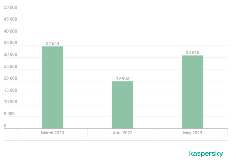 2023年3月,卡巴斯基反垃圾邮件解决方案检测并屏蔽了85362封针对加密货币用户的欺诈电子邮件。诈骗电子邮件活动在3月份达到顶峰,共收到34644条信息,在4月份屏蔽了19902封电子邮件,在5月份屏蔽了30816封。
