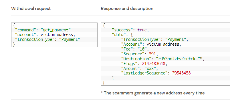 攻击者使用这两个API与受害者的XRP账户进行交互。钓鱼网站API与WebSocket地址对话,验证帐户详细信息并请求资金。为此,攻击者们专门设计了一次性的中间钱包。