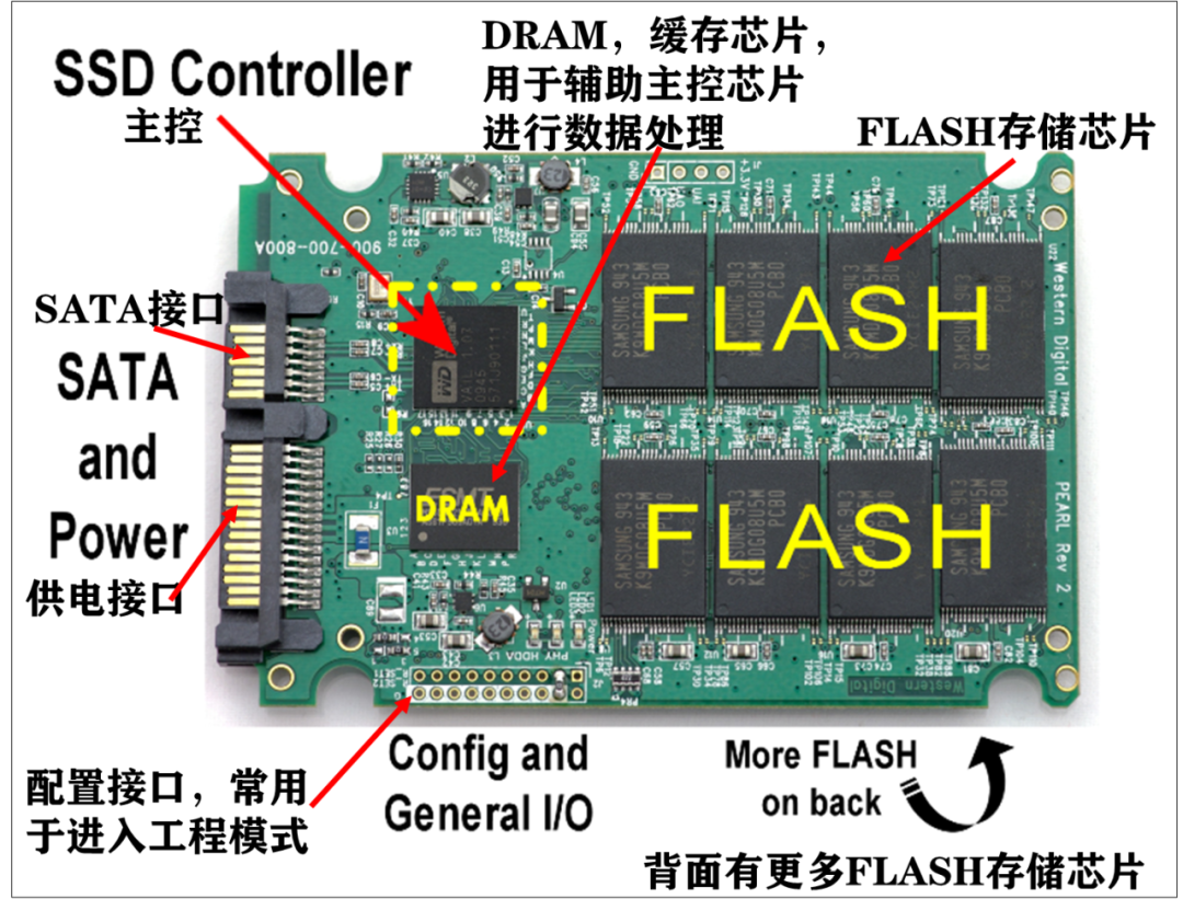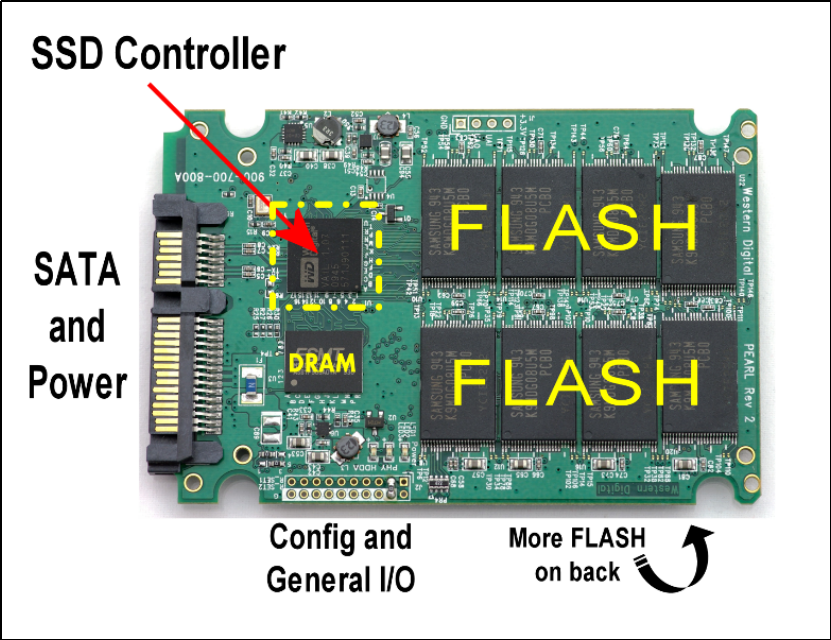 固态硬盘主控和闪存块,图像取自http://webscopia.com/2011/10/what-is-an-ssd-solid-state-disk-basics-and-performance-measures/