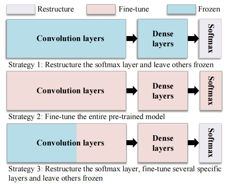 在第二阶段,针对时变环境部署辐射源设备的不同变化情况,本文提出了三种迁移策略,通过预训练模型实现变化后场景的识别模型的快速重构,分别为:1)面向场景辐射源缩减的迁移策略;2)面向场景辐射源局部替换的迁移策略;3)面向场景辐射源扩充的迁移策略。所提出的三种迁移策略是在原有的预训练模型上,主要采用重构、微调和冻结三种操作结合的方式对预训练模型的层进行调整,如图2所示。