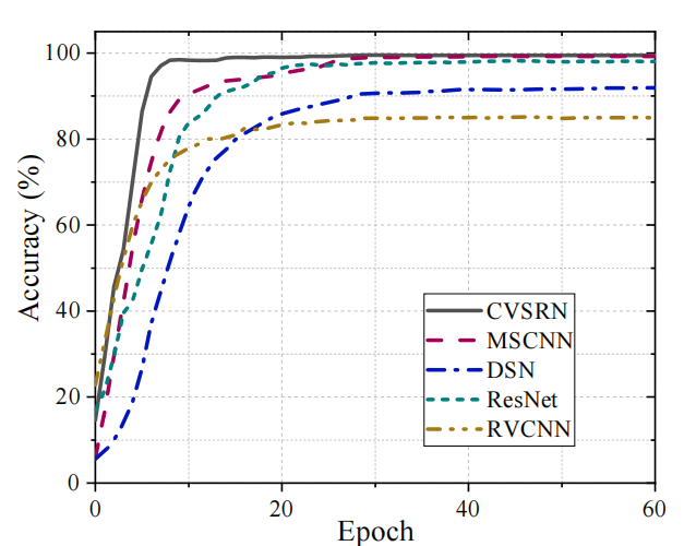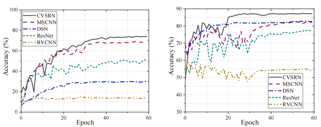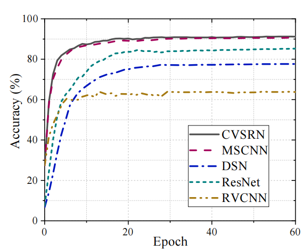 仿真分两个阶段进行。第一阶段,利用CVSRN提取信号样本的特征,构建预训练模型。通过将CVSRN的性能与深度信号网络(DSN)、实值卷积神经网络(RVCNN)、ResNet和多采样卷积神经网络(MSCNN)进行比较,验证CVSRN的优越性。DSN是一种复杂的基于网络的模型,它不使用剩余模块或多分支结构。RVCNN、ResNet和MSCNN都是基于实值的模型。