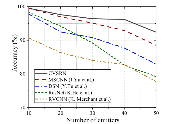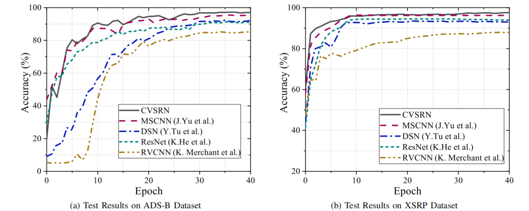 图6显示了CVSRN和基于DL的对比网络的总体精度曲线。图6(a)为ADS-B数据集上辐射源数量为20时的整个训练过程。可以看出,CVSRN比其他方法具有更好的识别性能。具体而言,基于多尺度的模型(CVSRN和MSCNN)具有更大的接受野,可以提取更多的信号特征。因此,它们比具有单一大小卷积核的(DSN, RVCNN, ResNet)具有更好的性能。复值模型(CVSRN和DSN)可以从实部信号和虚部信号的相互耦合关系中获取额外的信号特征;因此,它们比具有相同网络深度和相应参数设置的基于实值的模型(MSCNN和RVCNN)具有更高的精度。图6(b)显示了各种算法在XSRP数据集上的训练过程。由于与ADS-B相比,每个XSRP样本中的采样点数量更多,ADS-B在每个样本中包含更多辐射源的RFF信息,因此算法在该数据集上收敛速度更快。此外,可以观察到,所提出的CVSRN仍然取得了最好的识别性能和最快的收敛速度,进一步验证了本文设计结构的有效性。