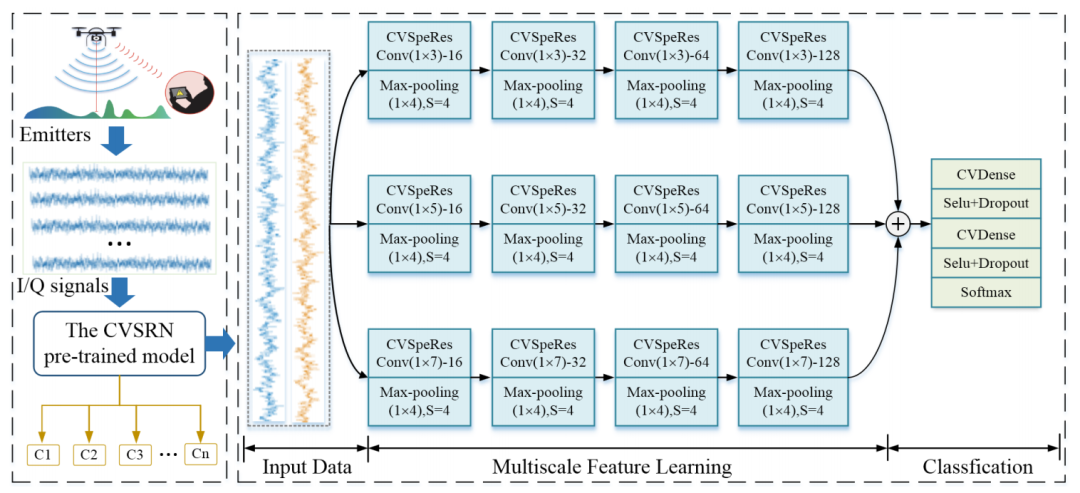 为了实现跨域复值SEI,本文首先设计了预训练的CVSRN模型,以最小化源域数据中的辐射源分类误差。考虑到信号的特征分布在多个时间尺度上,采用复数残差分割模块(CVSpeRes)构建了一种多尺度卷积神经网络架构,可同时进行特征提取和分类。所提出的CVSRN模型如图3所示,该模型包括三个阶段:输入数据、多尺度特征学习和分类。