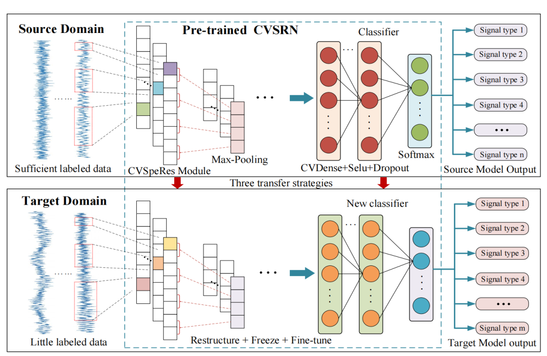 为了解决传统基于实值SEI方法特征提取不充分且迁移能力较差的问题,本文通过考虑复数信号实部和虚部之间的相互耦合关系,建立复值分离残差网络(CVSRN)作为预训练模型,精确提取辐射源的射频指纹特征(RFF)。此外,本文采用领域自适应技术,通过三种迁移策略,全面考虑了部署辐射源的各种可能的调度情况,以利用从预训练的CVSRN中学到的知识,促进第二阶段对新的但相似的辐射源的识别。建立从已有复值信号(源域)到新的复值信号(目标域)的知识迁移。