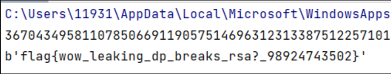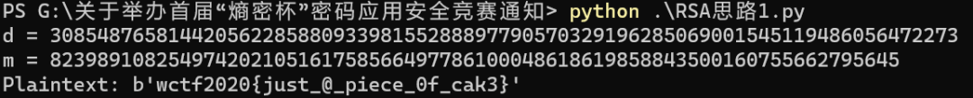 #!/usr/bin/env python3# -*- coding: utf-8 -*-import gmpy2from Crypto.Util.number import long_to_bytesq = 189239861511125143212536989589123569301p = 386123125371923651191219869811293586459e = 65537c = 28767758880940662779934612526152562406674613203406706867456395986985664083182n = q * pd = gmpy2.invert(e, (p - 1) * (q - 1))print("d =", d)m = pow(c, d, n)print("m =", m)plaintext = long_to_bytes(m)print("Plaintext:", plaintext)