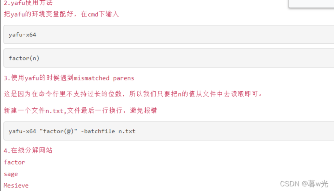 yafu-x64 factor(n) //常规分解nyafu-x64 "factor(@)" -batchfile 1.txt //把n复制到txt文件中再分解,用于n过长的情况