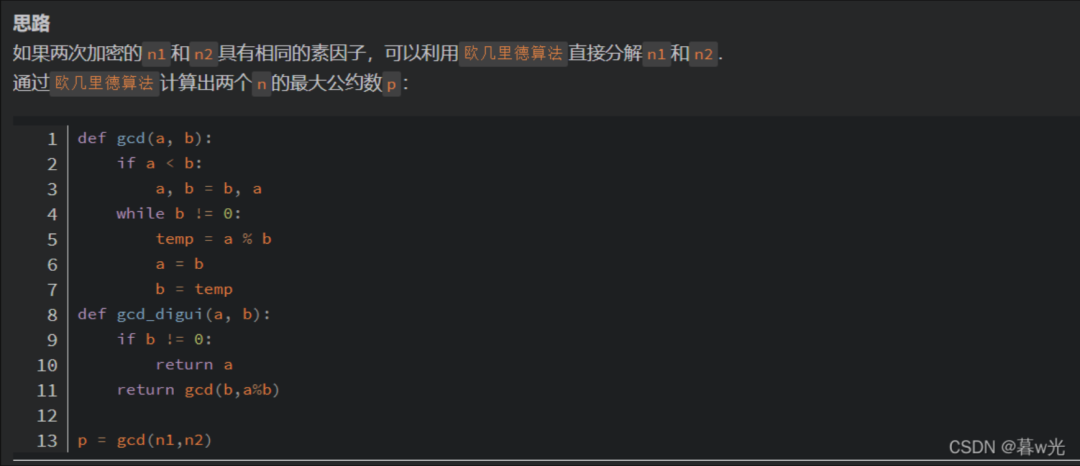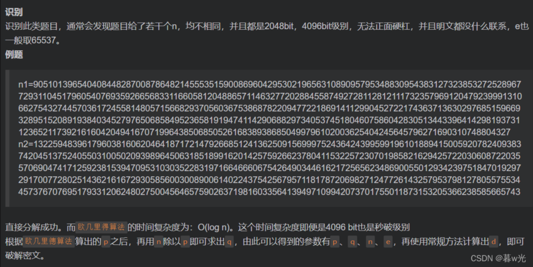 和上面的广播攻击类似,题目会给你很多组n和c。我们知道n=p*q,而p、q是两个大素数。所以说当有很多组n的时候,很有可能出现两个n之间存在公因数。而这个公因数就是p和q其中的一个,当然知道其中一个另一个也就知道了,我们就可以求出d进而根据对应密文求出m。
