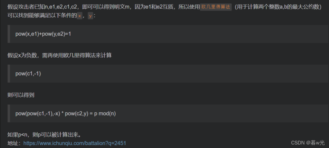 当题目给我们很多组c和e,但它们加密使用的模数n相同时,我们可以考虑共模攻击,当e1,e2互质,有gcd(e1,e2)=1,根据扩展欧几里得算法,一定存在整数x,y使得e1*x+e2*y=1。我们可以调用gmpy2.gcdext()来使用扩展欧几里得算法,以此求出x和y。