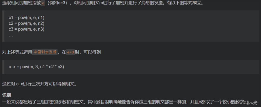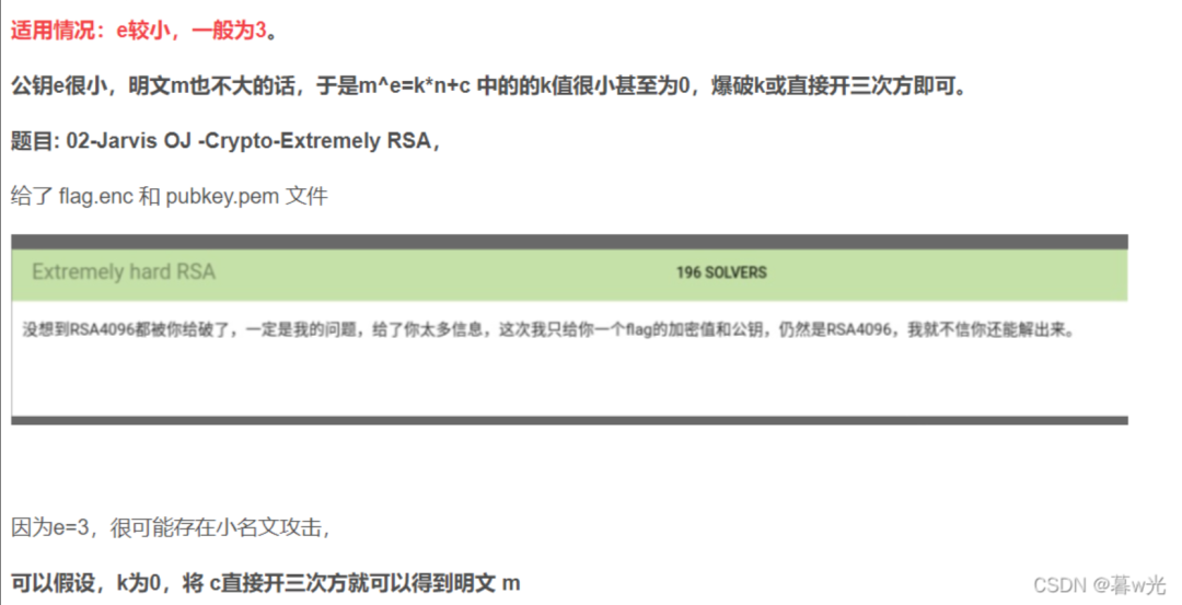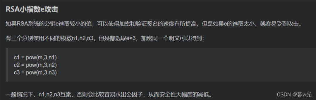 2.RSA低加密指数e攻击(e很小或很大):最好参考这篇博客。