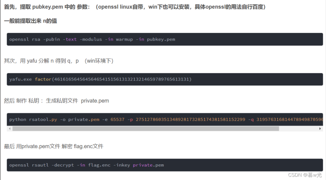 1.其实破解rsa最直接方法就是分解模数N得q、p,基本只适用于N较小的时候,不过为保证安全性大部分时候都很难解出来,参考: