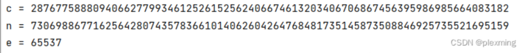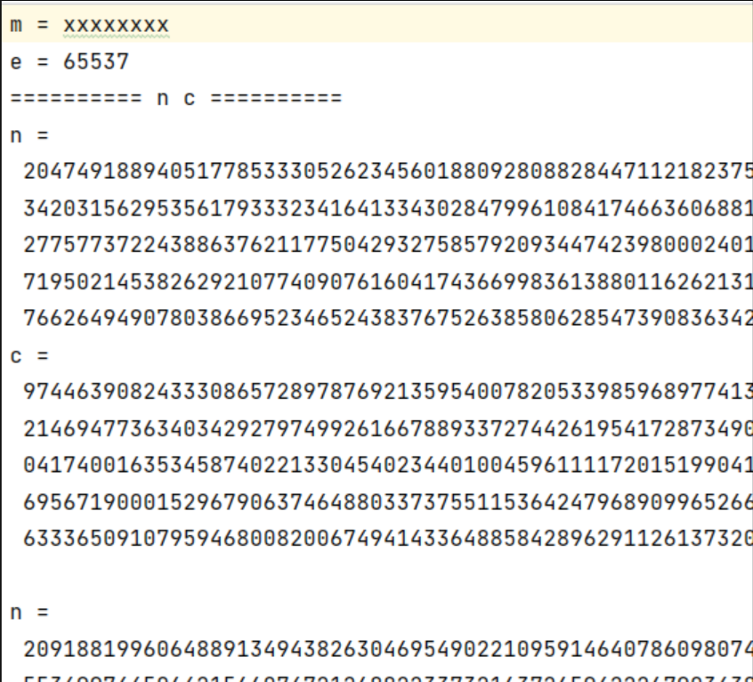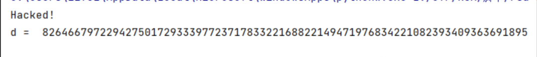 # !/usr/bin/env python3# -*- coding: utf-8 -*-import hashlibN = 101991809777553253470276751399264740131157682329252673501792154507006158434432009141995367241962525705950046253400188884658262496534706438791515071885860897552736656899566915731297225817250639873643376310103992170646906557242832893914902053581087502512787303322747780420210884852166586717636559058152544979471e = 46731919563265721307105180410302518676676135509737992912625092976849075262192092549323082367518264378630543338219025744820916471913696072050291990620486581719410354385121760761374229374847695148230596005409978383369740305816082770283909611956355972181848077519920922059268376958811713365106925235218265173085d = 8920758995414587152829426558580025657357328745839747693739591820283538307445dd = hex(d)[:] + "L"flag = "flag{" + hashlib.md5(dd.encode("utf-8")).hexdigest() + "}"print(flag)