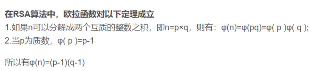 如果两个正整数a和n两者互质,则n的欧拉函数φ(n)也可以下面的等式也成立:a^φ(n)≡1(mod n)。也就是说,a的φ(n)次方被n除的余数为1。这就是φ(n)与公钥e互质的原因。
