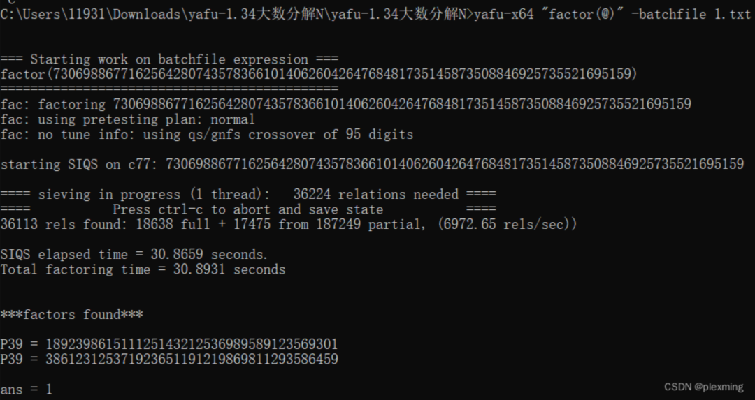 第二种:yafu大数分解工具,windows下载地址:yafu download | SourceForge.net使用相关命令分解n:
