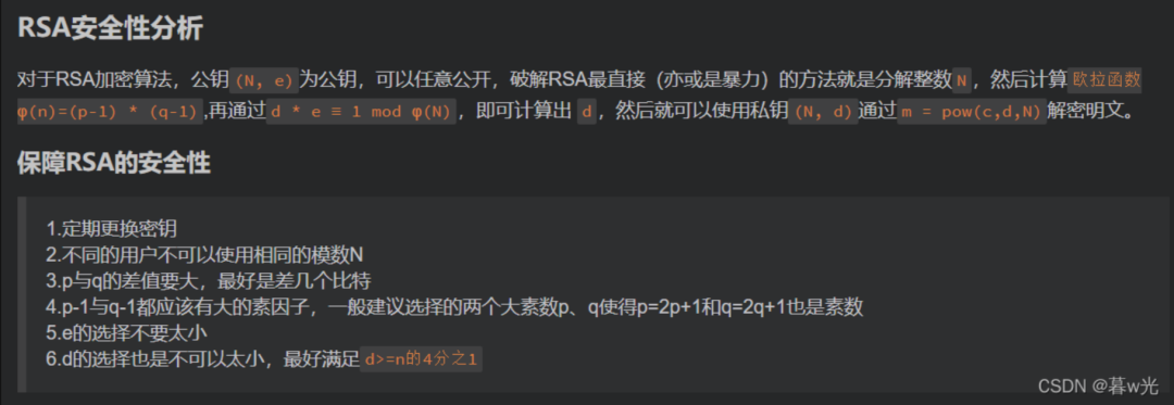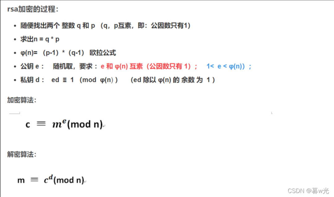 两个大素数 p,q:RSA加密的关键部分,一般不会告诉你。我们选取两个大素数并计算它们的乘积,得到n=p*q。后面会用p,q,n来加密解密。由于p,q非常大,想要对n进行因式分解得到p,q非常困难,这也确保了RSA的安全性。