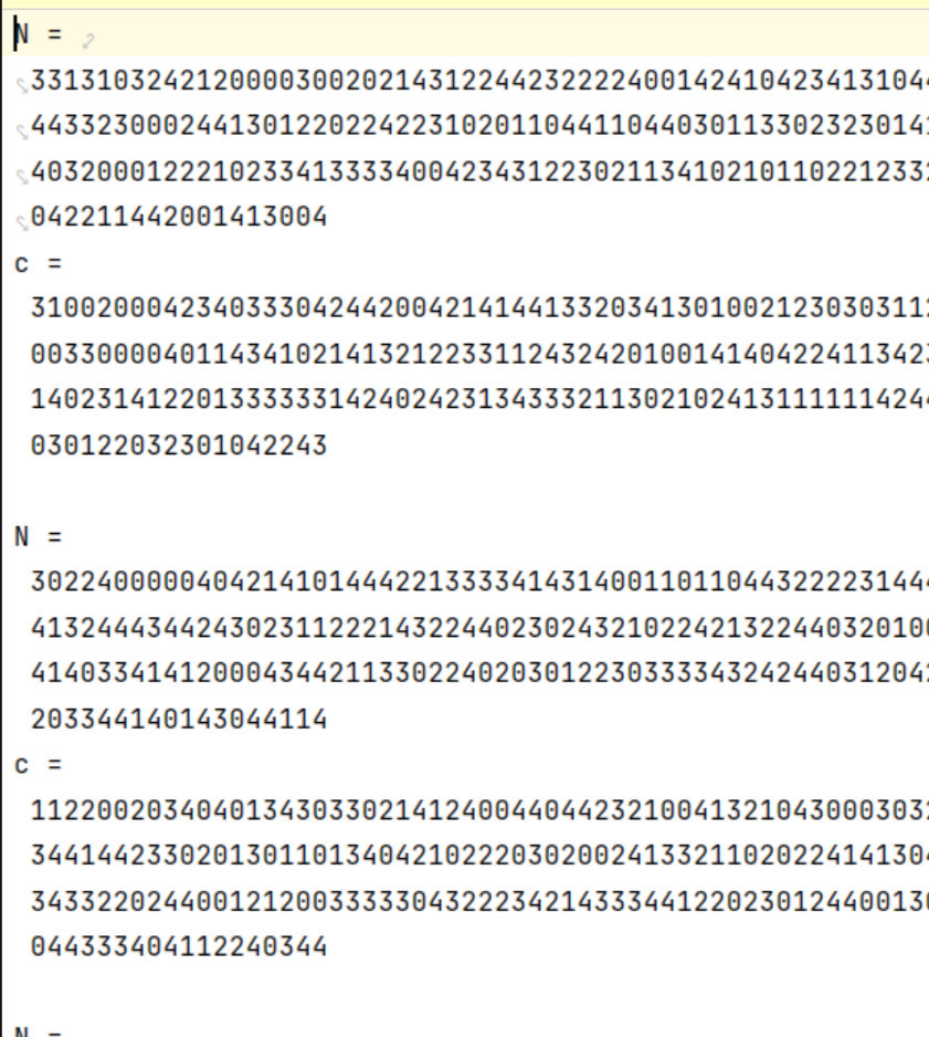 #!/usr/bin/env python3# -*- coding: utf-8 -*-import gmpy2from Crypto.Util.number import long_to_bytesfrom sympy.ntheory.modular import crtN1 = int('331310324212000030020214312244232222400142410423413104441140203003243002104333214202031202212403400220031202142322434104143104244241214204444443323000244130122022422310201104411044030113302323014101331214303223312402430402404413033243132101010422240133122211400434023222214231402403403200012221023341333340042343122302113410210110221233241303024431330001303404020104442443120130000334110042432010203401440404010003442001223042211442001413004', 5)c1 = int('310020004234033304244200421414413320341301002123030311202340222410301423440312412440240244110200112141140201224032402232131204213012303204422003300004011434102141321223311243242010014140422411342304322201241112402132203101131221223004022003120002110230023341143201404311340311134230140231412201333333142402423134333211302102413111111424430032440123340034044314223400401224111323000242234420441240411021023100222003123214343030122032301042243', 5)N2 = int('302240000040421410144422133334143140011011044322223144412002220243001141141114123223331331304421113021231204322233120121444434210041232214144413244434424302311222143224402302432102242132244032010020113224011121043232143221203424243134044314022212024343100042342002432331144300214212414033414120004344211330224020301223033334324244031204240122301242232011303211220044222411134403012132420311110302442344021122101224411230002203344140143044114', 5)c2 = int('112200203404013430330214124004404423210041321043000303233141423344144222343401042200334033203124030011440014210112103234440312134032123400444344144233020130110134042102220302002413321102022414130443041144240310121020100310104334204234412411424420321211112232031121330310333414423433343322024400121200333330432223421433344122023012440013041401423202210124024431040013414313121123433424113113414422043330422002314144111134142044333404112240344', 5)N3 = int('332200324410041111434222123043121331442103233332422341041340412034230003314420311333101344231212130200312041044324431141033004333110021013020140020011222012300020041342040004002220210223122111314112124333211132230332124022423141214031303144444134403024420111423244424030030003340213032121303213343020401304243330001314023030121034113334404440421242240113103203013341231330004332040302440011324004130324034323430143102401440130242321424020323', 5)c3 = int('10013444120141130322433204124002242224332334011124210012440241402342100410331131441303242011002101323040403311120421304422222200324402244243322422444414043342130111111330022213203030324422101133032212042042243101434342203204121042113212104212423330331134311311114143200011240002111312122234340003403312040401043021433112031334324322123304112340014030132021432101130211241134422413442312013042141212003102211300321404043012124332013240431242', 5)e = 3n = [N1, N2, N3]c = [c1, c2, c3]resultant, mod = crt(n, c)value, is_perfect = gmpy2.iroot(resultant, e)# Convert the integer to bytes and decode as a stringplaintext_bytes = long_to_bytes(value)plaintext_string = plaintext_bytes.decode(errors='ignore')print(plaintext_string)