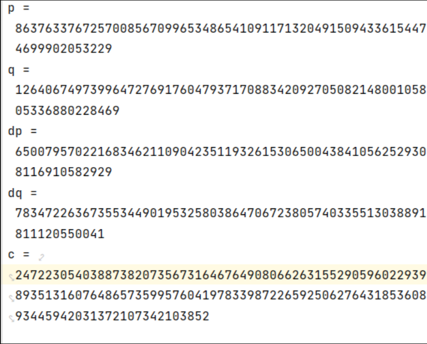 m1 = c^dpmodpm2 = c^dqmodqm = (((m1-m2)*I)%p)*q+m2其中I为对pq求逆元