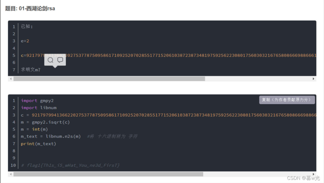 #!/usr/bin/env python3# -*- coding: utf-8 -*-import libnumfrom Crypto.Util.number import long_to_bytesdef rsa_decrypt(ciphertext, n, e, p, q):d = libnum.invmod(e, (p - 1) * (q - 1))decrypted_data = pow(ciphertext, d, n)return decrypted_dataif __name__ == "__main__":c = 0x6cd55a2bbb49dfd2831e34b76cb5bdfad34418a4be96180b618581e9b6319f86 # c:密文n = 108539847268573990275234024354672437246525085076605516960320005722741589898641e = 65537q = 333360321402603178263879595968004169219p = 325593180411801742356727264127253758939# 解密密文,得到明文数值mm = rsa_decrypt(c, n, e, p, q)# 将明文数值m转换为字节串,即字符串string = long_to_bytes(m)print("解密后的明文为:", string.decode('utf-8'))