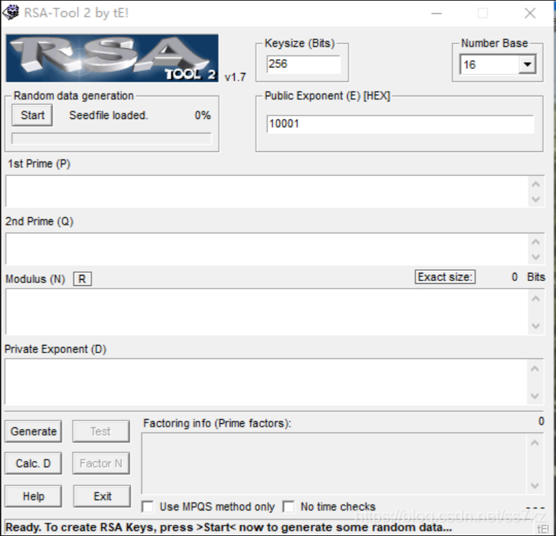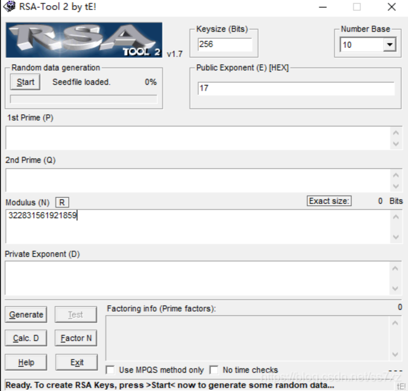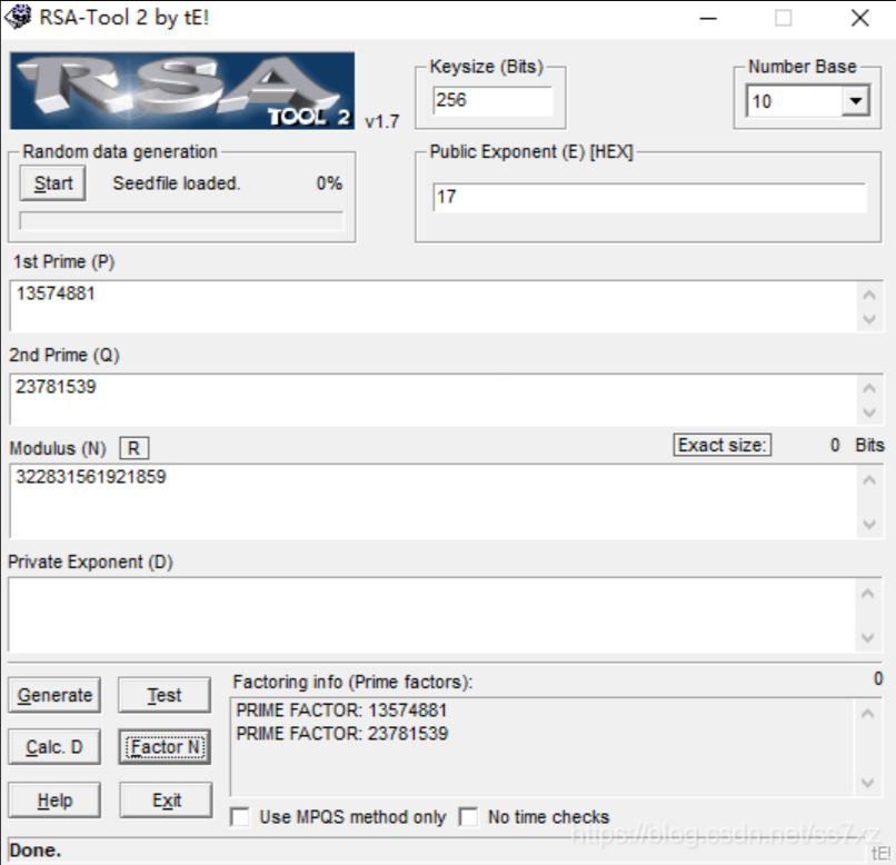 2.将N=322831561921859 填入,左下角有一个 Factor N 的按钮,这是分解 N 的意思,点一下,会自动开始分解因数,得到 P=13574881、Q=23781539。