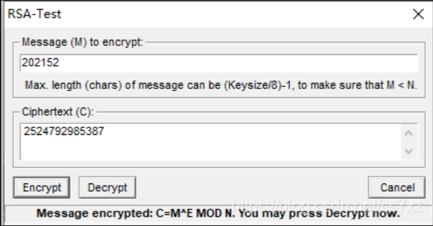 4.第一个框是明文,第二个框是密文,随意输入一段明文 202152,点击 Encrypt,得到密文 2524792985387,这时就可以使用解密功能。